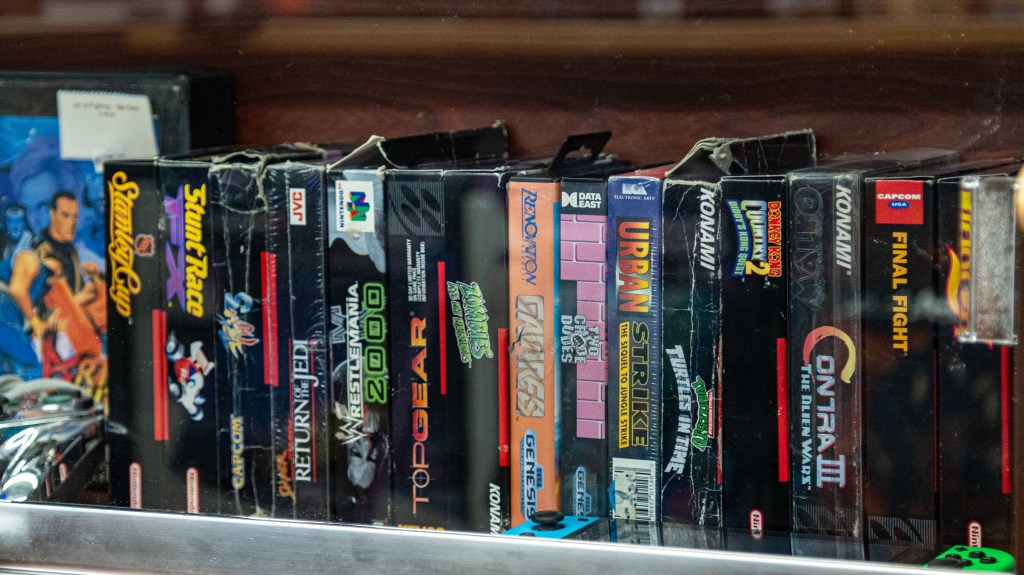 Games from several retro consoles behind glass for sale at Galactic Gamez in Fort Worth. Many collectors seek out only games that come complete in their original packaging. (Joseph Morgan | Fort Worth Report)