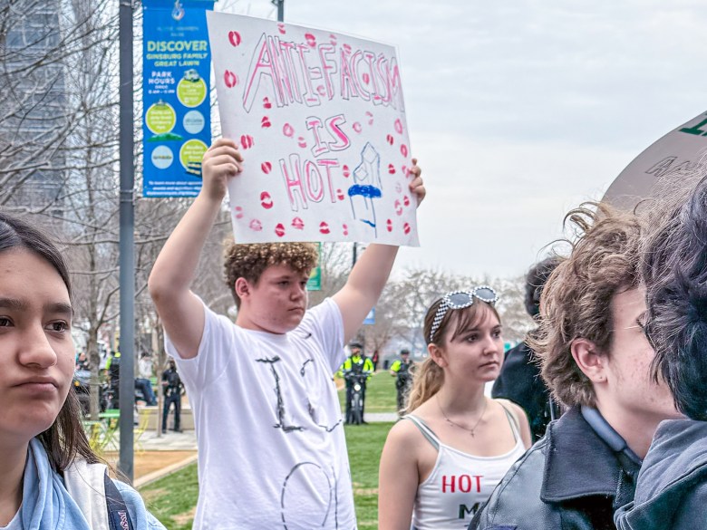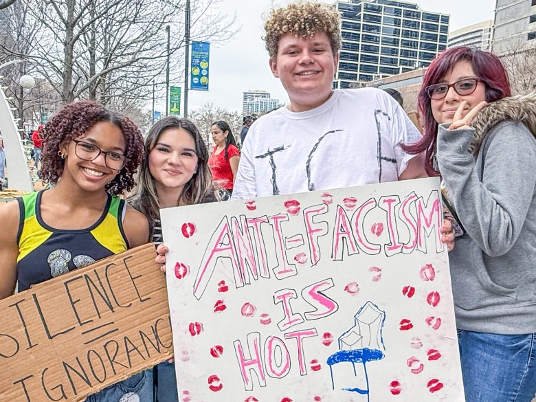 Grayson McFerrin Hogan, center with the whiteT-shirt and holding the sign that says “Anti-Fascism is Hot,” was one of the students who organized the ICE Out student protest at Booker T. Washington High School today. He said students Bo;oker T students were protesting because “It is our duty to stand up for those who cannot stand up for themselves.”