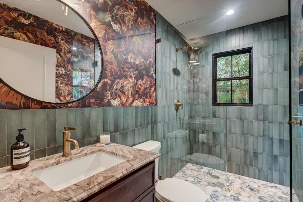 Each space reflects a curated balance of history and design: a cozy den with its brick fireplace and Western-themed mantel, a sunroom overlooking the golf course, and bathrooms where natural stone and bold patterns meet modern fixtures.