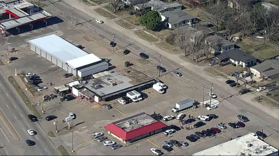 Images from SKY 4 showed crime scene tape that spans across the parking lots for a gas station, tire company, burger shop and barbecue pit.