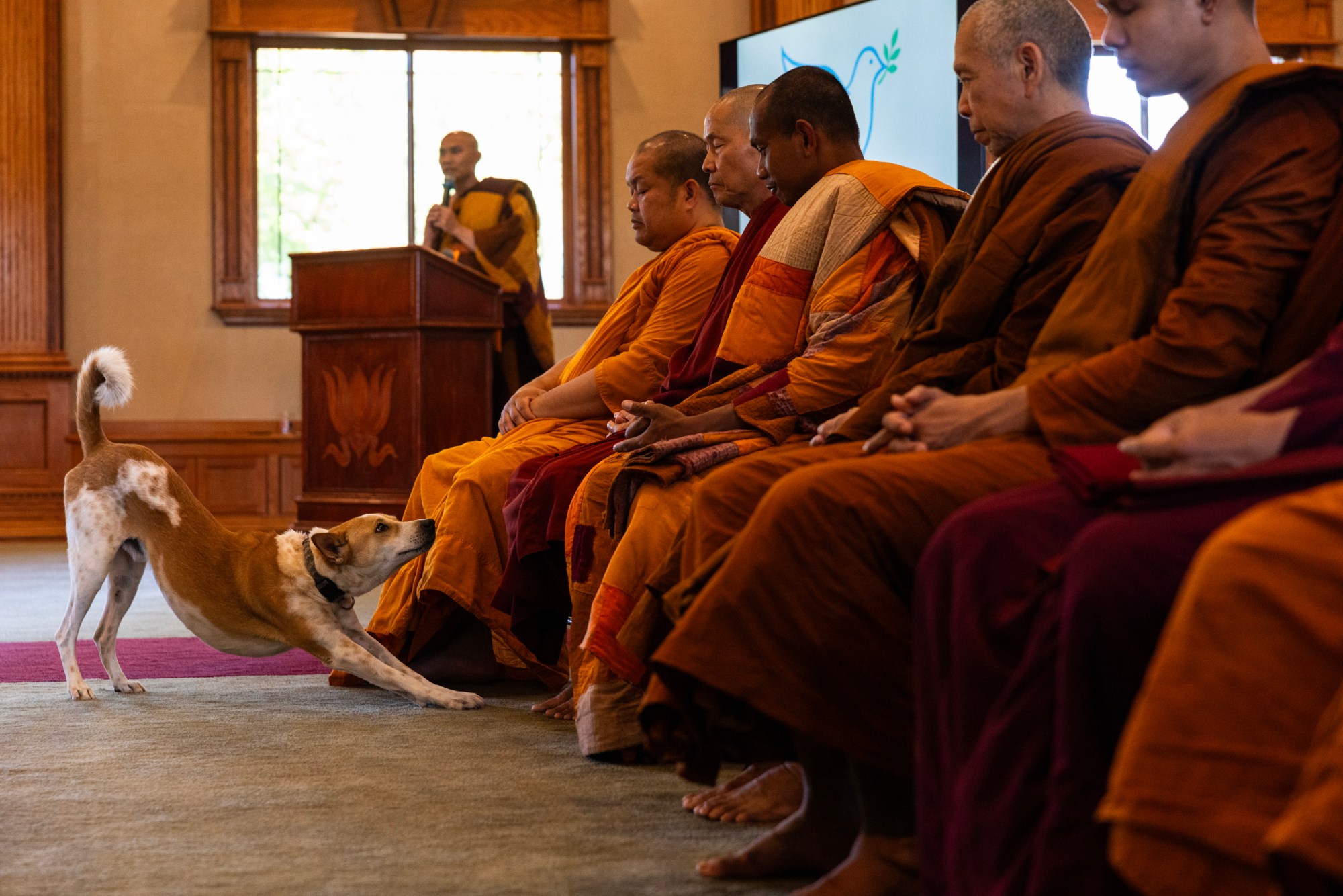 Aloka the peace dog leads the way home to the Huong Dao Vipassana Bhavana Center. Maria Crane | Fort Worth Report/CatchLight Local/Report for America