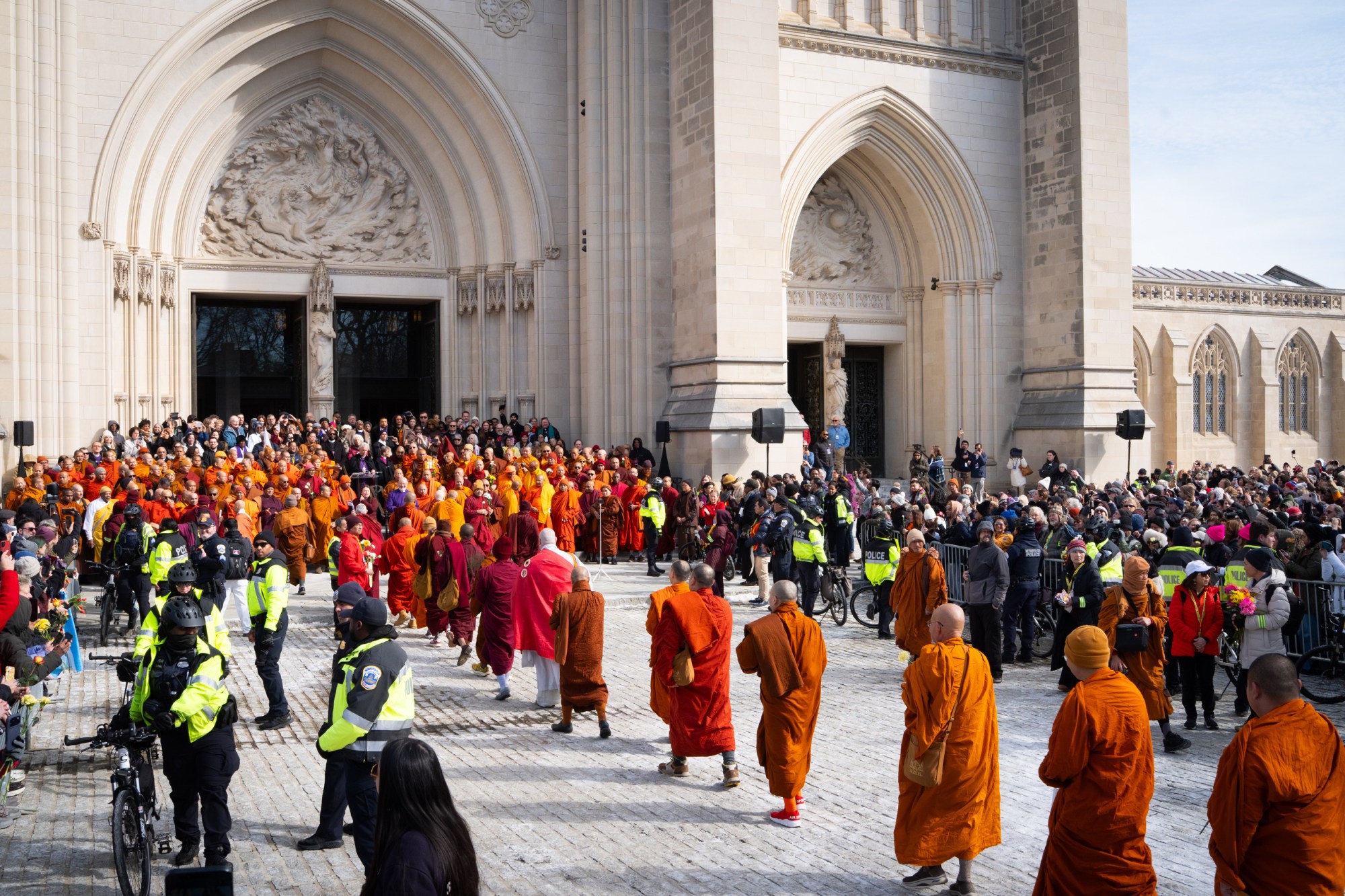 Buddhist monks participating in the Walk for Peace arrive at the Washington National Cathedral on Tuesday, Feb. 10, 2026, in Washington, D.C. Thousands came out to see them. Sarah L. Voisin for Fort Worth Report