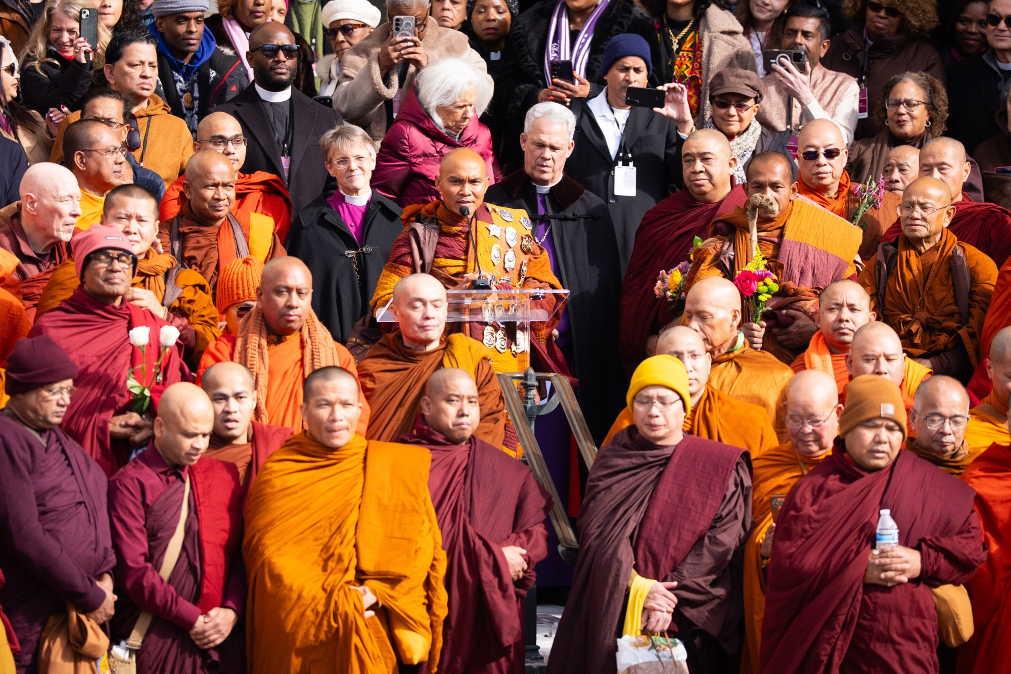 Venerable Bhikkhu Pannakara speaks to the crowd at the Washington National Cathedral on Feb. 10, 2026, in Washington, D.C. Sarah L. Voisin for Fort Worth Report