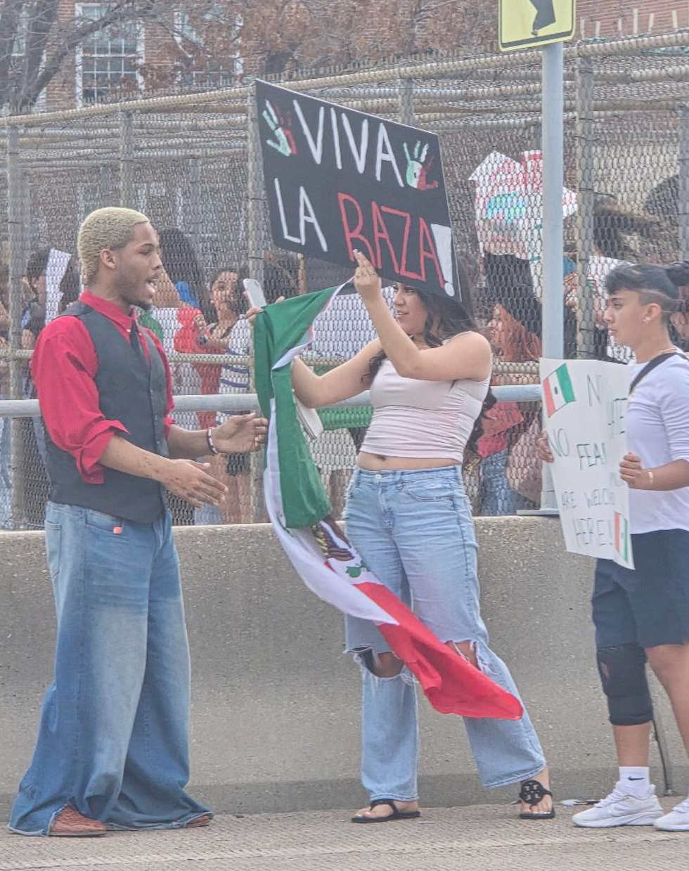 Meanwhile, other photos obtained by DX show students standing on the I-30 frontage roads, without sidewalks, holding Mexican flags and protest signs.
