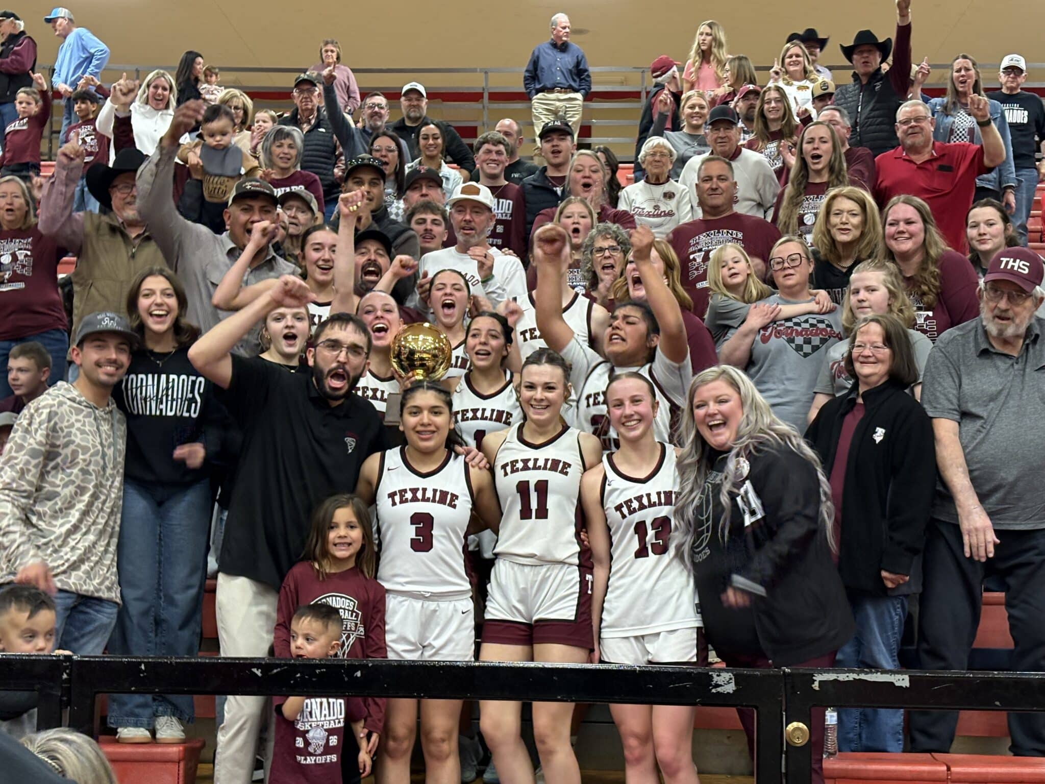 The Texline Lady Tornadoes celebrate with their fans after winning the Class 1A Division II regional championship against Whitharral on Monday night at Tascosa High School. [Lance Lahnert/ For Press Pass Sports]