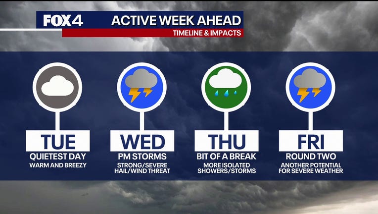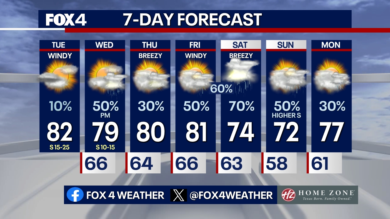 Tuesday is expected to be warm with breezy conditions. The wind has created an elevated fire threat, particularly for areas west of the Metroplex. Temperatures will peak in the low 80s this afternoon before dropping into the 60s tonight. A cold front arriving late tonight will serve as the catalyst for severe weather through the weekend.
