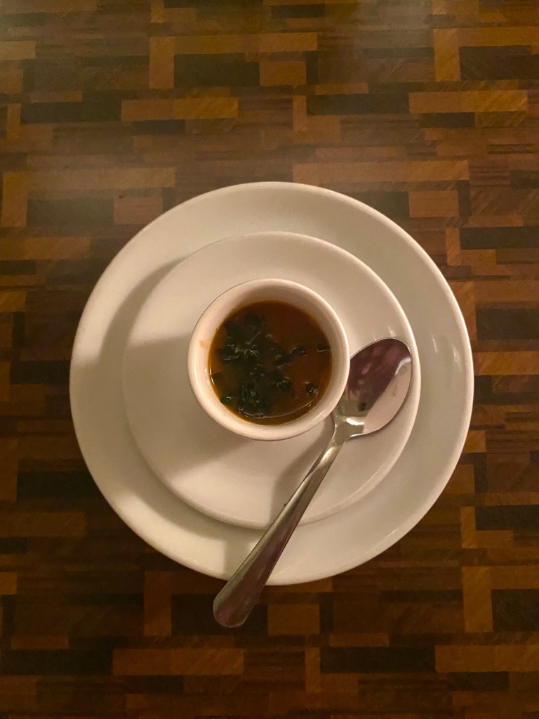 But don’t conflate consistency with boredom. An amuse-bouche of roasted Roma tomato soup, for example, opened the palate with a shot of hot, sexy, salty, tomatoey goodness. Next up, a salad of sautéed Brussels sprouts, tender lettuces, and grilled bruschetta dressed in lemon vinaigrette, teased just the right hint of spring.