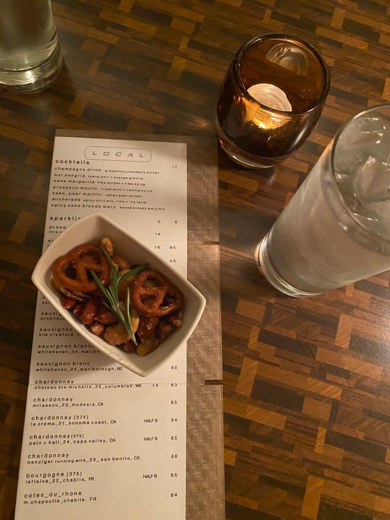 Looking over the menu, we savored a complimentary dish of warm, rosemary-flecked nut mix. Local’s edited offerings change regularly, representing Miller’s seasonal takes on the classics. Self-trained, the Texas-born chef immersed herself in the culinary scenes of New York City and the Napa Valley in the ‘90s as she envisioned what her own restaurant would one day become.