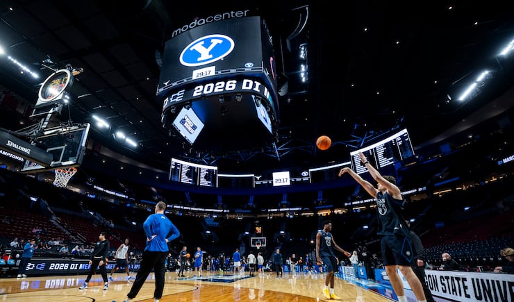 BYU players warm up during a practice the day before a first-round college basketball game against Texas in the NCAA Tournament held at the Moda Center in Portland, Oregon, on Wednesday, March 18, 2026. | Isaac Hale, Deseret News
