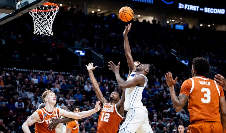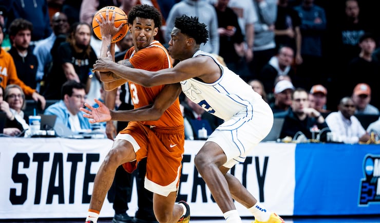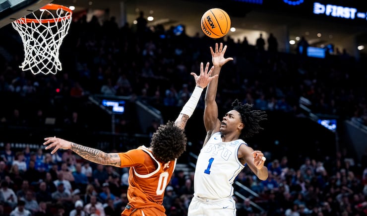 A shot from BYU guard Robert Wright III (1) is blocked by Texas guard Tramon Mark (12) during a first-round college basketball game in the NCAA Tournament held at the Moda Center in Portland, Ore., on Thursday, March 19, 2026. | Isaac Hale, Deseret News