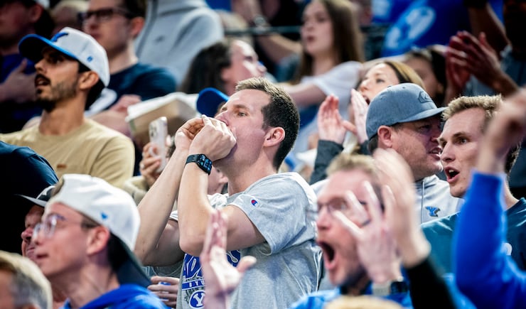 BYU fans cheer after a play against Texas during a first-round college basketball game in the NCAA Tournament held at the Moda Center in Portland, Ore., on Thursday, March 19, 2026. | Isaac Hale, Deseret News