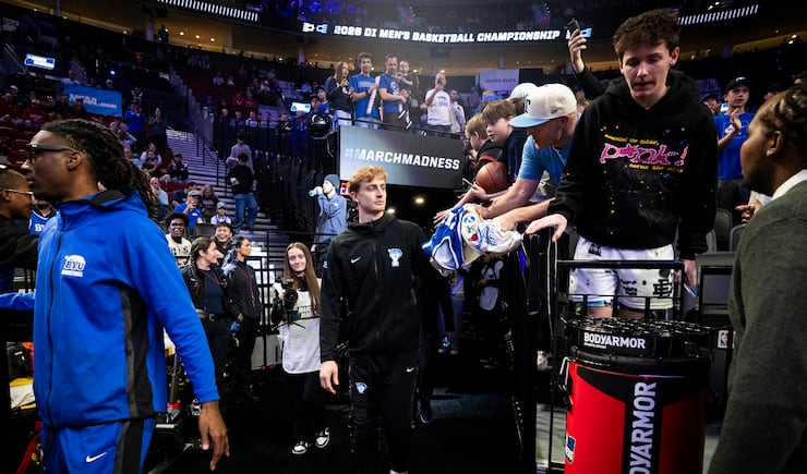 BYU guard Richie Saunders looks to fans offering items for him to sign before a first-round college basketball game against Texas in the NCAA Tournament held at the Moda Center in Portland, Ore., on Thursday, March 19, 2026. | Isaac Hale, Deseret News