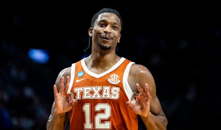 Texas guard Tramon Mark (12) celebrates after hitting a 3-pointer to end the first half during a first-round college basketball game against BYU in the NCAA Tournament held at the Moda Center in Portland, Ore., on Thursday, March 19, 2026. | Isaac Hale, Deseret News