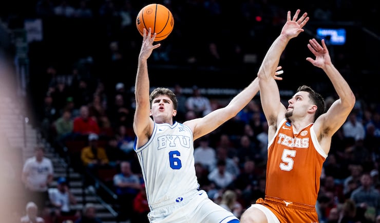 BYU guard Aleksej Kostić (6) lays the ball up while guarded by Texas forward Camden Heide (5) during a first-round college basketball game in the NCAA Tournament held at the Moda Center in Portland, Ore., on Thursday, March 19, 2026. | Isaac Hale, Deseret News