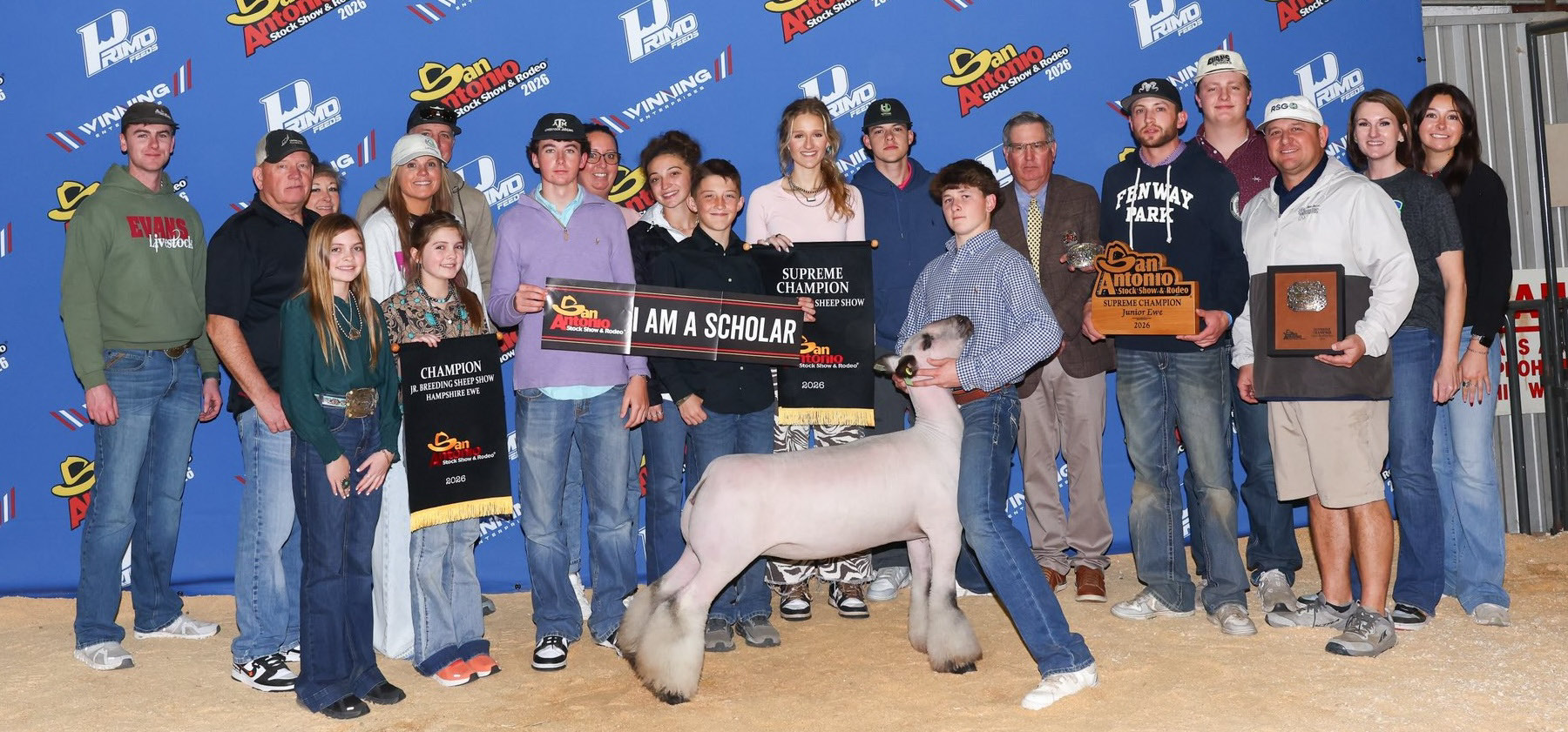 Cooper Evans (front, center) was awarded $15,000 for exhibiting the Supreme Champion Breeding Sheep. Contributed photos