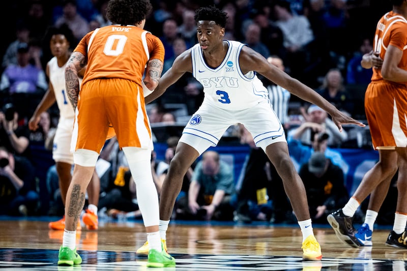 BYU forward AJ Dybantsa (3) guards Texas forward Dailyn Swain (3) during a first-round college basketball game in the NCAA Tournament held at the Moda Center in Portland, Ore., on Thursday, March 19, 2026. | Isaac Hale, Deseret News