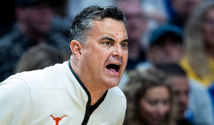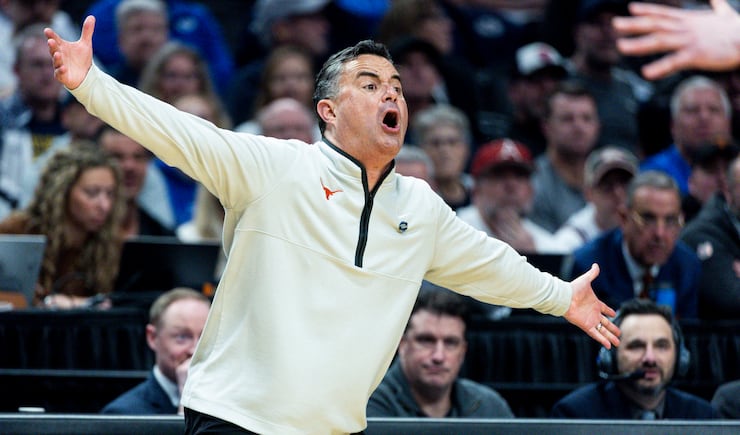 Texas head coach Sean Miller calls out to his players during a first-round college basketball game against BYU in the NCAA Tournament held at the Moda Center in Portland, Ore., on Thursday, March 19, 2026. | Isaac Hale, Deseret News