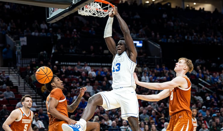 A shot from BYU guard Robert Wright III (1) is blocked by Texas guard Tramon Mark (12) during a first-round college basketball game in the NCAA Tournament held at the Moda Center in Portland, Ore., on Thursday, March 19, 2026. | Isaac Hale, Deseret News