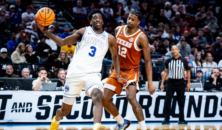BYU forward AJ Dybantsa (3) falls back after being fouled by Texas forward Dailyn Swain (3) during a first-round college basketball game in the NCAA Tournament held at the Moda Center in Portland, Ore., on Thursday, March 19, 2026. | Isaac Hale, Deseret News