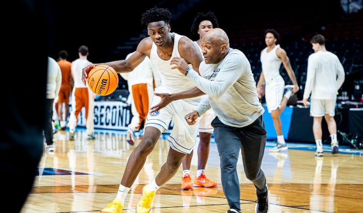 BYU forward AJ Dybantsa warms up with assistant coach John Linehan before a first-round college basketball game against Texas in the NCAA Tournament held at the Moda Center in Portland, Ore., on Thursday, March 19, 2026. | Isaac Hale, Deseret News