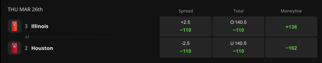 Houston opens as a 2.5-point favorite and holds -162 moneyline odds on DraftKings Sportsbook. Illinois has +136 odds to pull off the upset, with the game total set at 140.5 points.