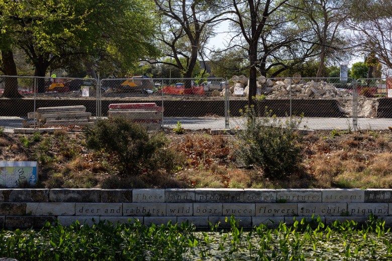 Demolition on the Soap Factory Apartments is underway at the phase one lot on the 500 block of North Santa Rosa and West Martin streets to make way for Urban Weston’s Missions Baseball development seen from San Pedro Creek on March 18, 2026. Credit: Amber Esparza / San Antonio Report