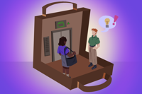 A scene inside a briefcase shows a man and a woman facing each other in front of an elevator. The man has a speech bubble with a lightbulb in it and an exclamation mark extending from it.