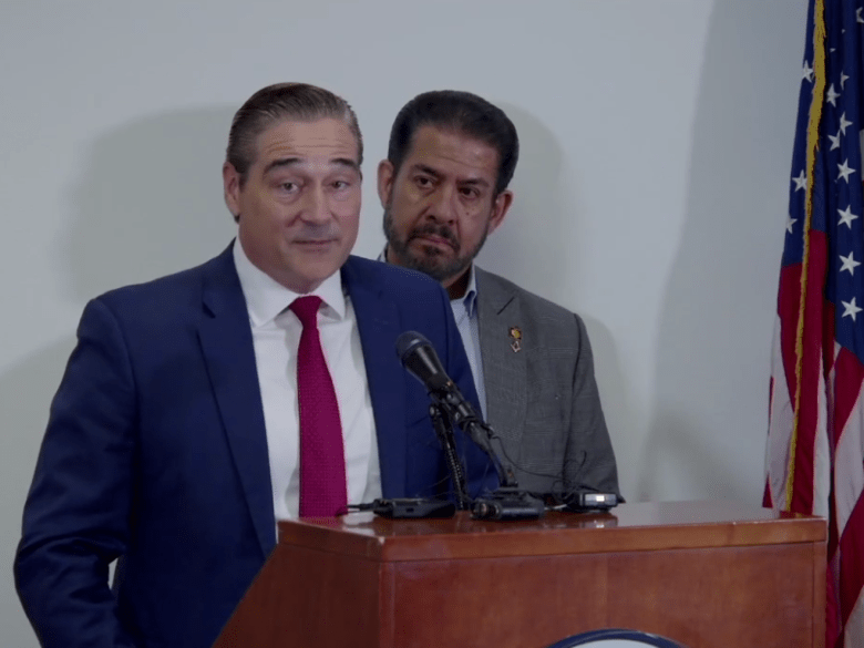 District Attorney Sean Teare and Harris County Commissioner Adrian Garcia talk to reporters at a March 17 press conference. Credit: Screenshot