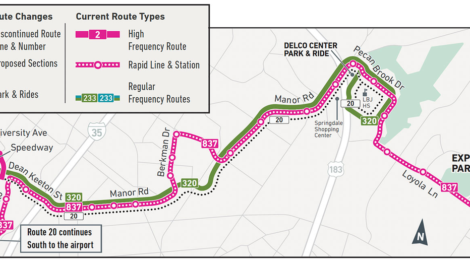 South of UT: Remains high‑frequency service along Riverside Dr to the airportNorth of UT: Becomes a new local route called Route 320 Manor Rd/Dean Keeton, operating every 30 minutes as underlying service for Rapid 837
