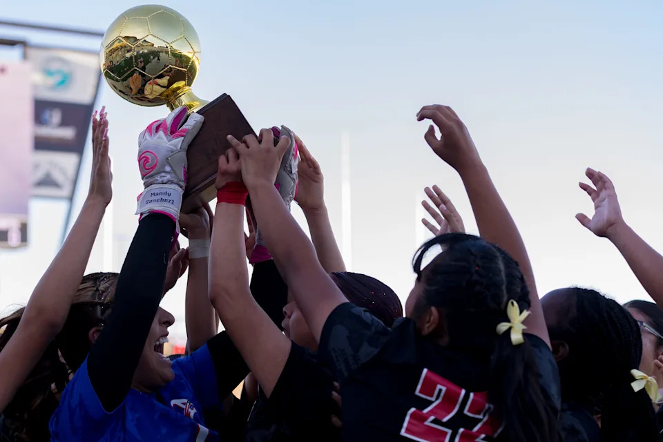 Americas players lift a trophy after defeating Chapin 3-2 in overtime during a Class 5A Division I girls soccer playoff game Thursday, March 19, 2026, at SAC 2 in El Paso, Texas.
