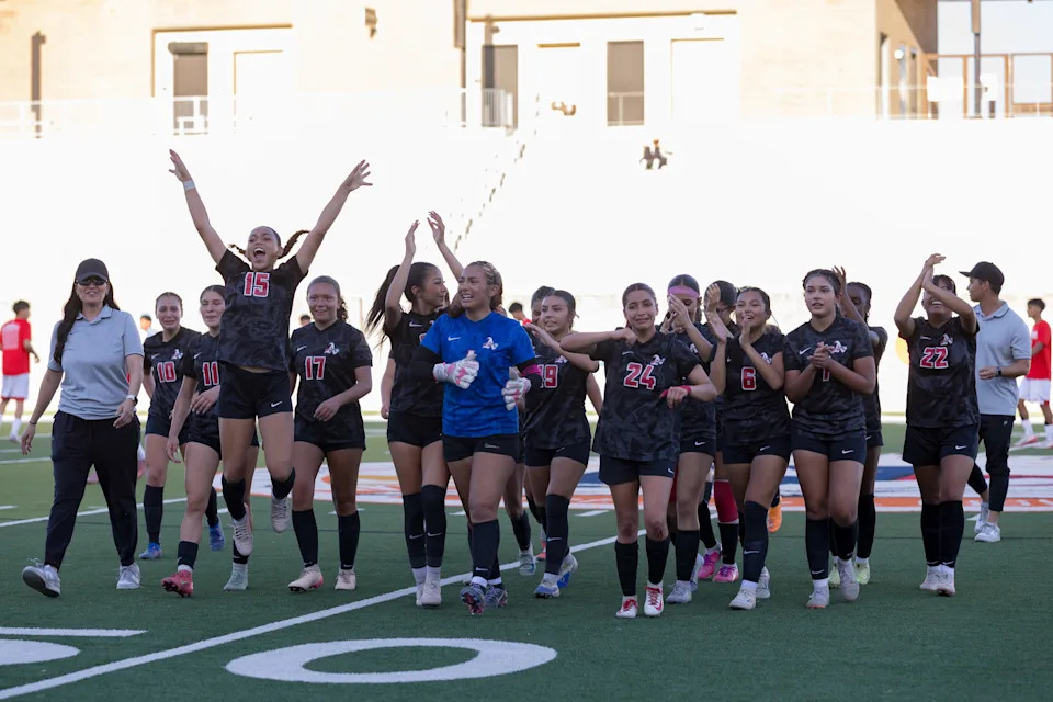 Americas players celebrate after defeating Chapin 3-2 in overtime during a Class 5A Division I girls soccer playoff game Thursday, March 19, 2026, at SAC 2 in El Paso, Texas.