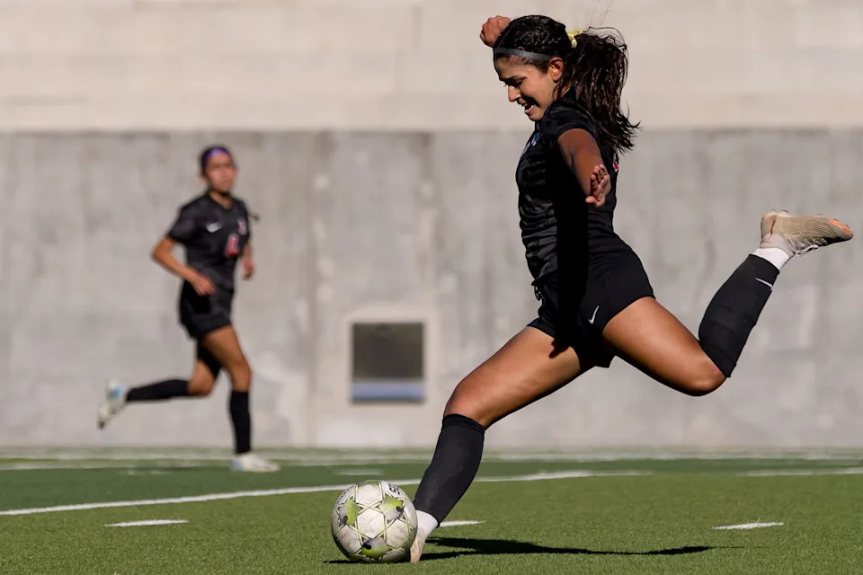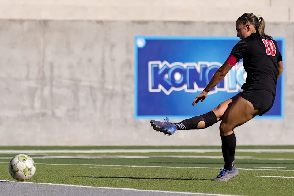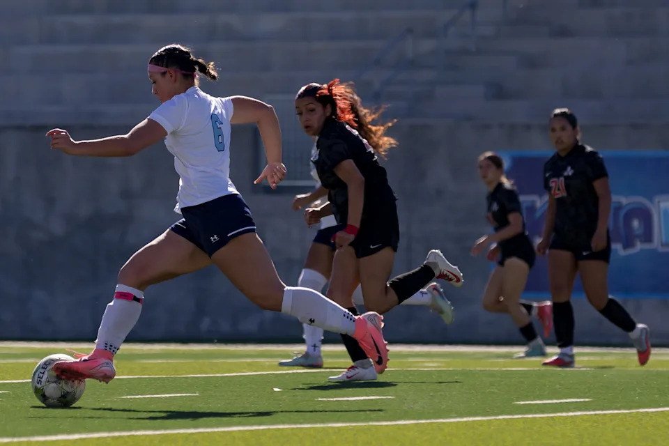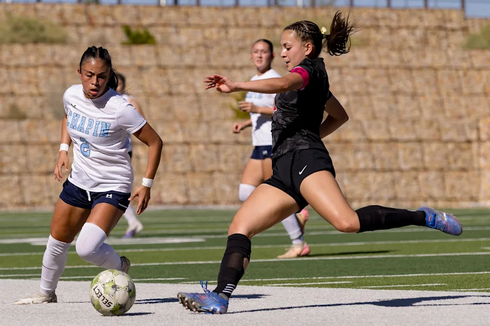 Chapin’s Stephanie Aguilera (6) kicks the ball against Americas during a Class 5A Division I girls soccer playoff game Thursday, March 19, 2026, at SAC 2 in El Paso, Texas.