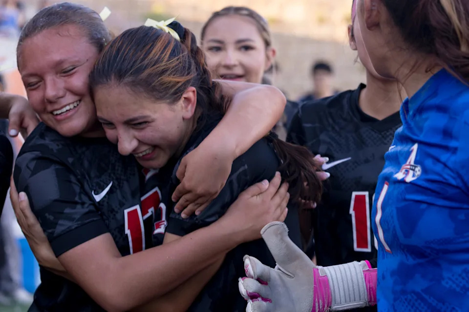 Americas players celebrate their 3-2 overtime win against Chapin during a Class 5A Division I girls soccer playoff game Thursday, March 19, 2026, at SAC 2 in El Paso, Texas.