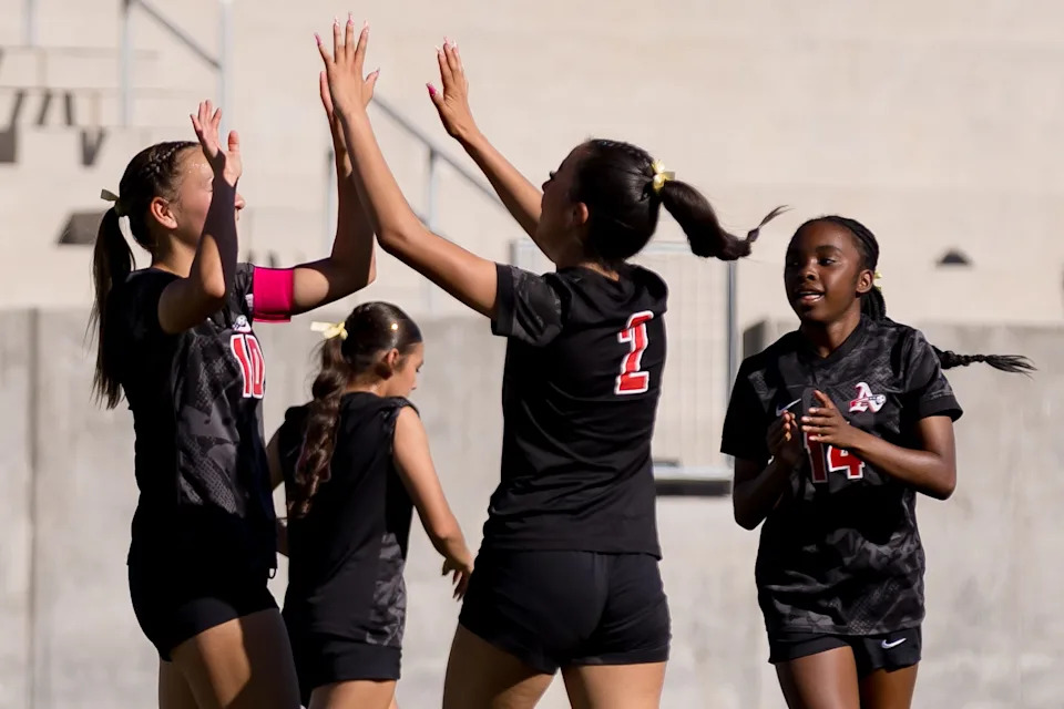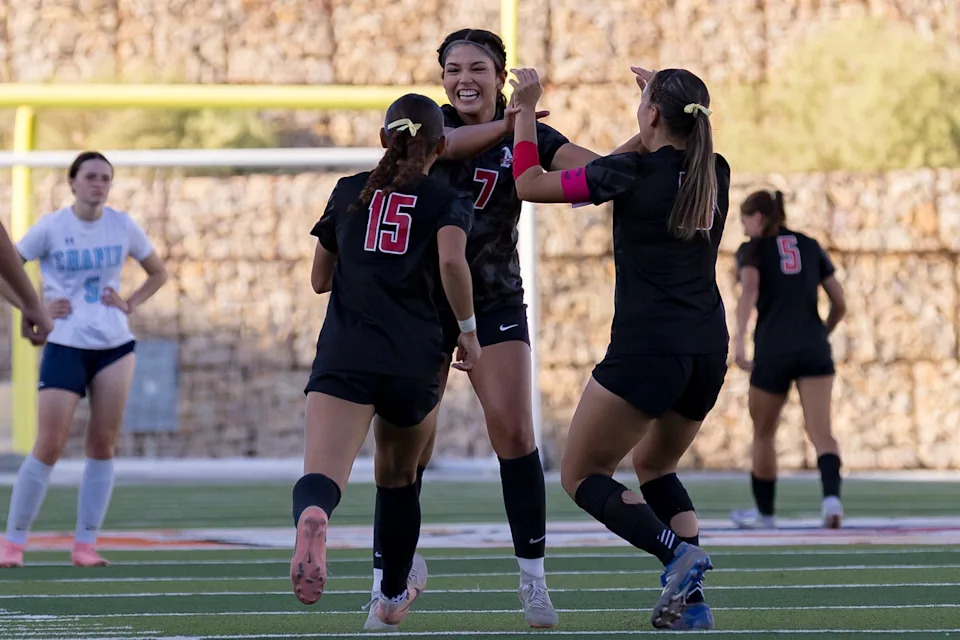 Americas’ players celebrate a goal against Chapin during a Class 5A Division I girls soccer playoff game Thursday, March 19, 2026, at SAC 2 in El Paso, Texas.