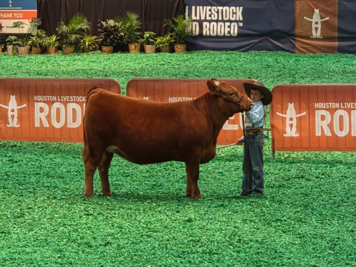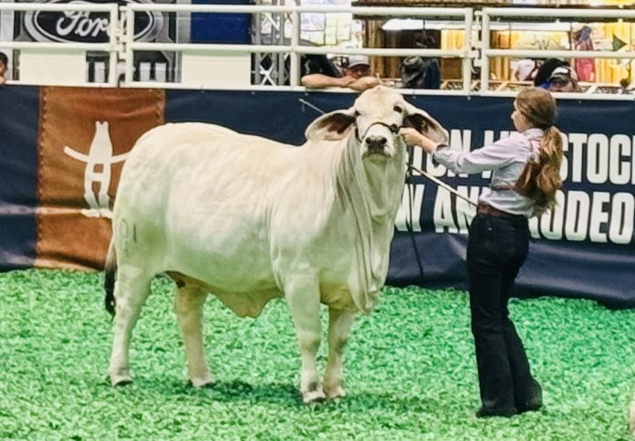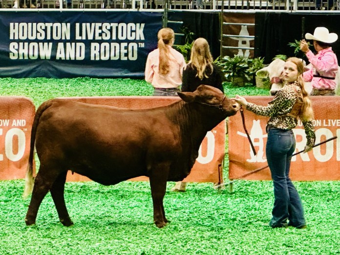 Madison Parker stands with her Grand Champion Red Brahman female after earning top honors at the Houston Livestock Show.