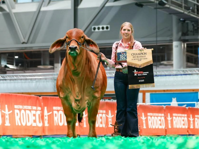 Madison Parker stands with her Grand Champion Red Brahman female after earning top honors at the Houston Livestock Show.