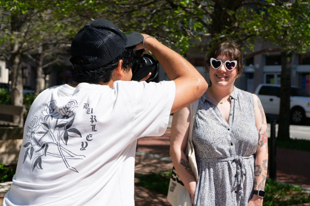Ontario Mireles snaps a photo of Kaitlyn Tully after stopping her at Sundance Square Plaza on March 24, 2026. (David Moreno | Fort Worth Report)