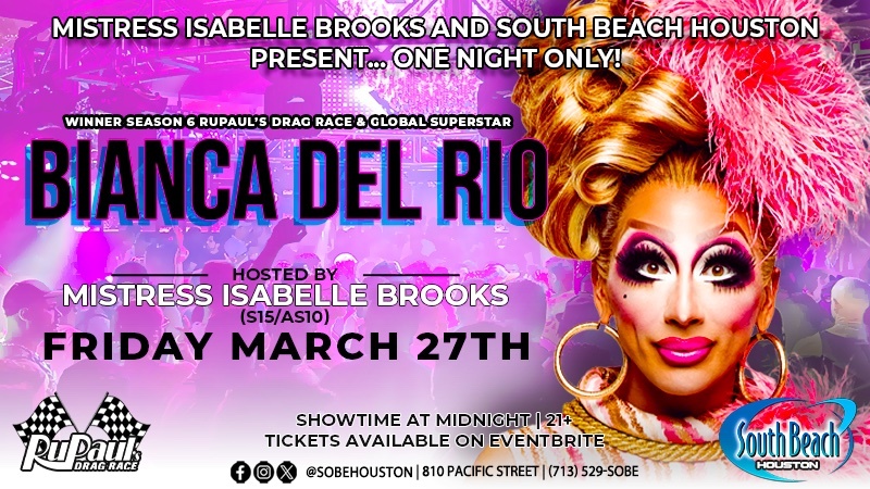 RuPaul’s Drag Race winner, global superstar Bianca Del Rio comes to Houston for a show hosted by Mistress Isabelle Brooks. South Beach Houston, 810 Pacific St. Midnight.
