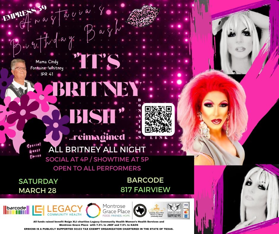 Anastacia Borque Fontaine-Whitney celebrates her birthday with her annual fundraising homage to Britney Spears, “It’s Britney Bish”…Reimagined. All Britney…All Night. Barcode Houston, 817 Fairview St. 4 p.m.