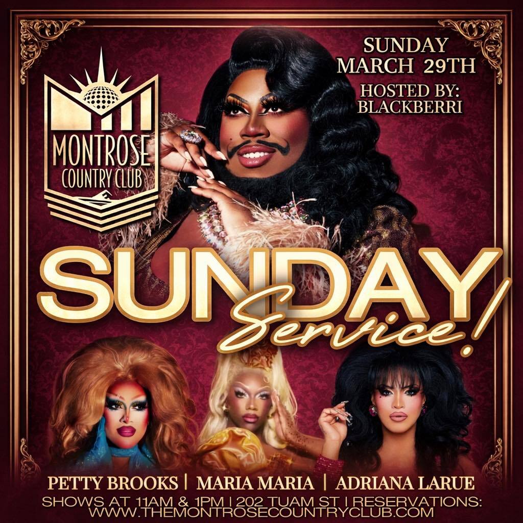 The Montrose Country Club presents Sunday Service Drag Brunch. This week, Blackberri hosts shows featuring spectacular performances from Petty Brooks, Maria Maria, and Adriana LaRue. 202 Tuam St. Shows at 11 a.m. and 1 p.m.
