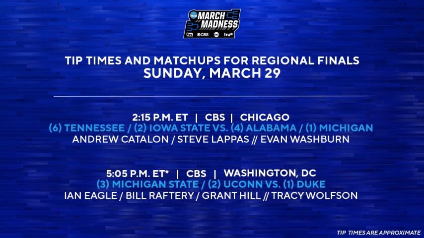 CBS Sports and TNT Sports announce tip times and commentators for regional finals on Sunday, March 29