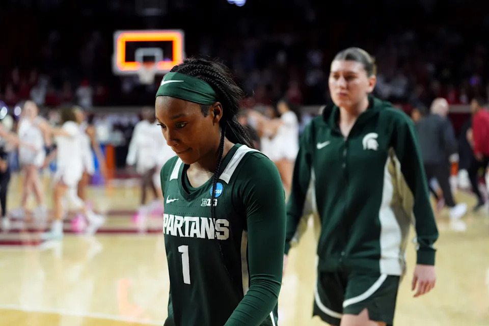Michigan State’s Rashunda Jones (1) walks off the court following a second-round game in the NCAA women’s basketball tournament between the Oklahoma Sooners and Michigan State Spartans at Lloyd Noble Center in Norman, Okla., Sunday March 22, 2026.