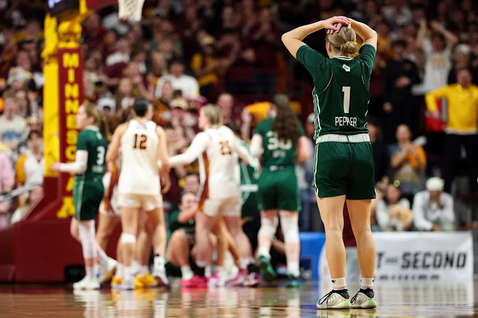 Kamy Peppler #1 of the Green Bay Phoenix reacts against the Minnesota Golden Gophers in the third quarter during the First Round of the Women’s NCAA Tournament at Williams Arena on March 20, 2026 in Minneapolis, Minnesota. The Golden Gophers defeated the Phoenix 75-58.