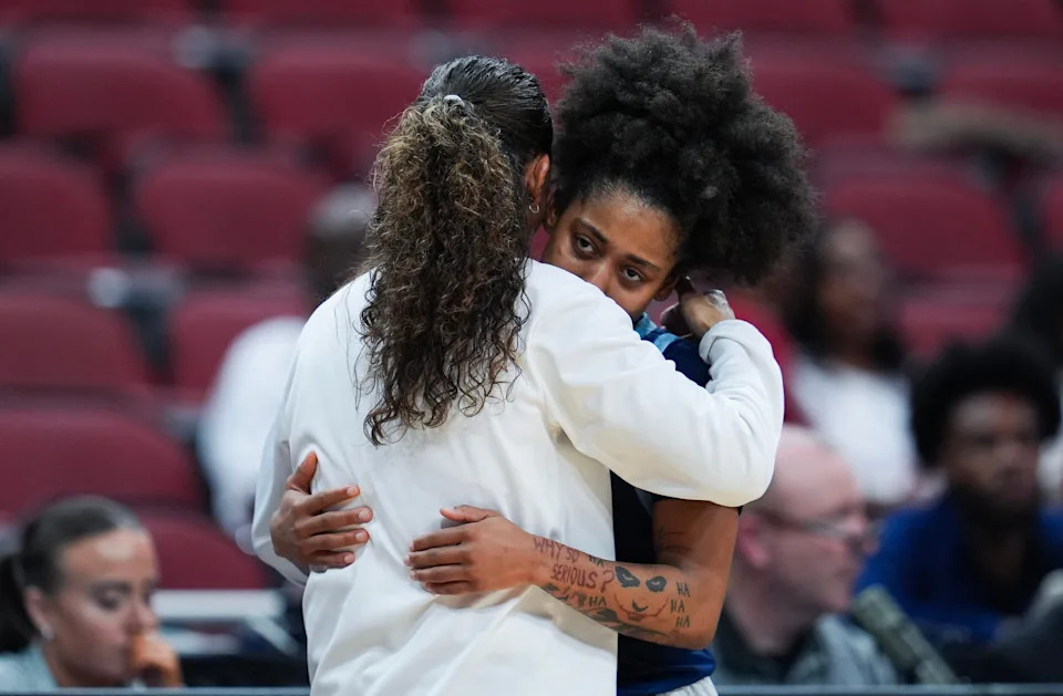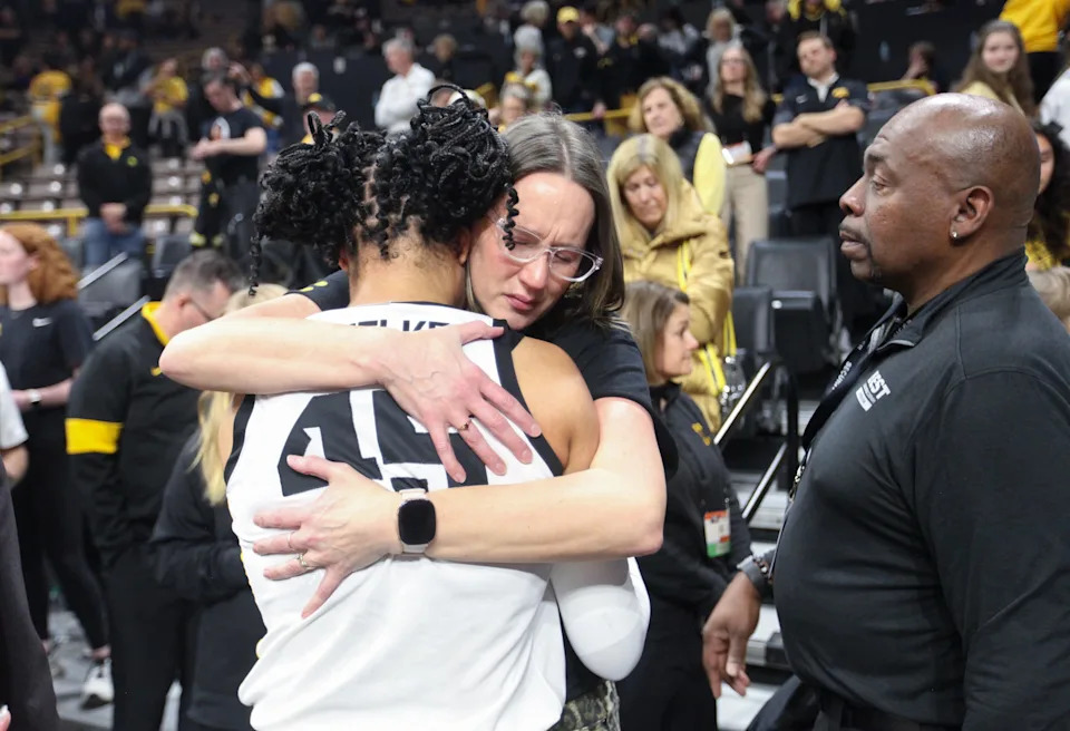 Forward Hannah Stuelke #45 of the Iowa Hawkeyes hugs her mother after the double overtime loss to the Virginia Cavaliers in the second round of the NCAA women’s basketball tournament at Carver-Hawkeye Arena on March 23, 2026 in Iowa City, Iowa.