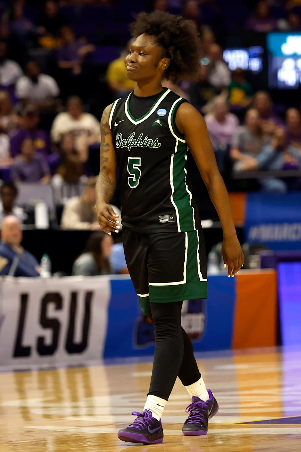 Comari Mitchell #5 of the Jacksonville Dolphins reacts during the second half of the game against the LSU Tigers in the first round of the 2026 NCAA Women’s Basketball Tournament at Pete Maravich Assembly Center on March 20, 2026 in Baton Rouge, Louisiana.