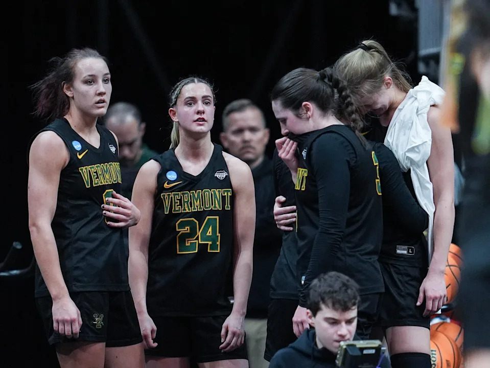 The Vermont women’s basketball team starters consoled each other as the Caramounts lost to Louisville at the 2026 NCAA Women’s March Madness basketball tournament at the KFC Yum Center In Louisville, Kentucky, March 21, 2026.
