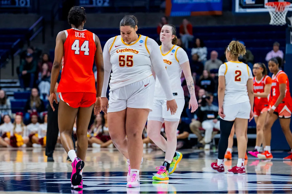 Audi Crooks #55 of the Iowa State Cyclones reacts during the second half in the first round of the 2026 NCAA Women’s Basketball Tournament against the Syracuse Orange at Harry A. Gampel Pavilion on March 21, 2026 in Storrs, Connecticut.