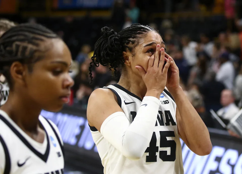 Forward Hannah Stuelke #45 of the Iowa Hawkeyes reacts after a double overtime loss to the Virginia Cavaliers in the second round of the NCAA women’s basketball tournament at Carver-Hawkeye Arena on March 23, 2026 in Iowa City, Iowa.