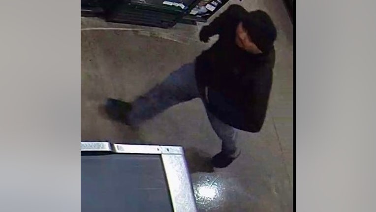 After reviewing surveillance footage, detectives identified a person of interest seen leaving the store following the incident. The suspect is described as a Hispanic male wearing a black beanie, a black hoodie-style sweatshirt, blue jeans, and black shoes.