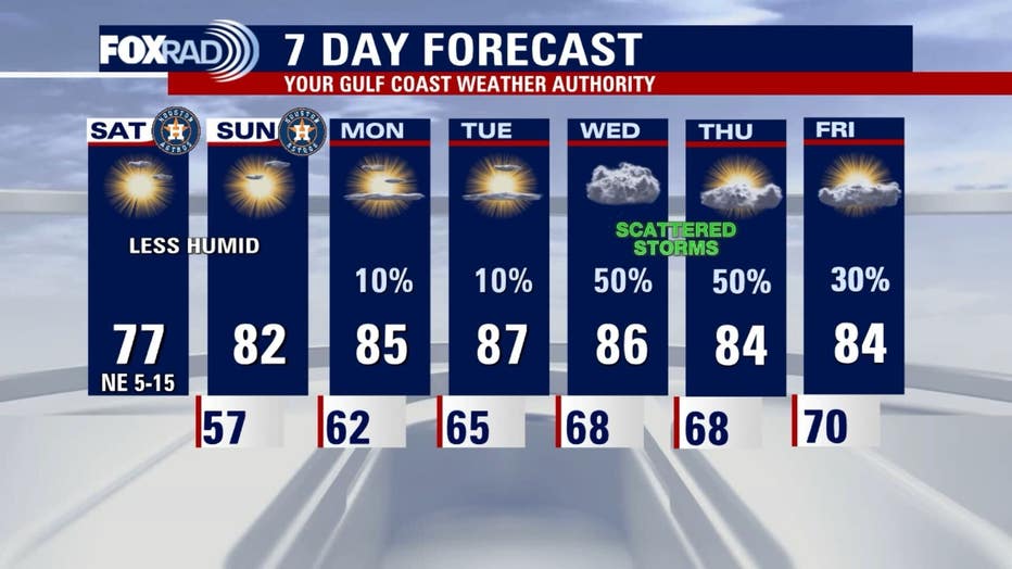 A weak front has moved through Southeast Texas, bringing in noticeably drier air to start Saturday. Expect a mix of clouds early with more sunshine developing this afternoon. It will feel less humid and more comfortable overall, with no rain expected.